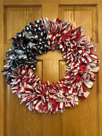 LOT 20 - Show your patriotic spirit with this handmade 21” wreath crafted with 3 different red, white and blue calico fabrics. This decoration is sure to brighten up your décor!