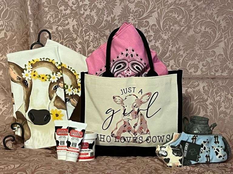 LOT 18 - Any girl who loves cows will also love this package! It includes a “Just a Girl Who Loves Cows” heavy canvas tote, pink bandana, 2 cow-themed kitchen towels, packet of 12 farm-themed anklets, small decorative milk can, Udderly Smooth gift set, and cow shaped and colored soap. Be sure to make mooooooooves to bid on this gem!