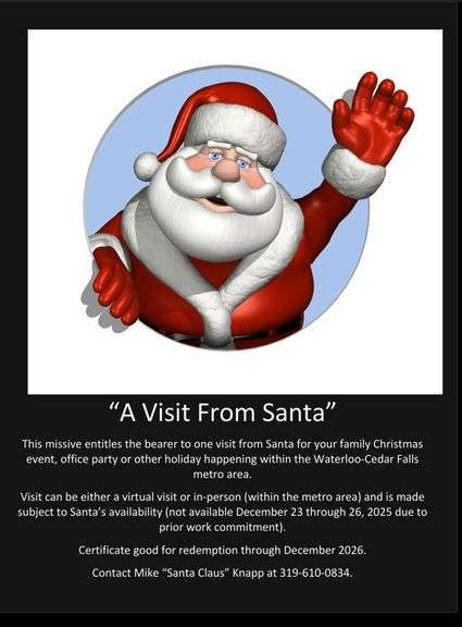 LOT 3 - Visit from Santa Claus - View picture - Santa visit has to take place within the Waterloo/Cedar Falls -metro area - no outside communities